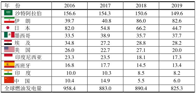 2016~2019年前十位國(guó)家燃油發(fā)電(單位:TWh)