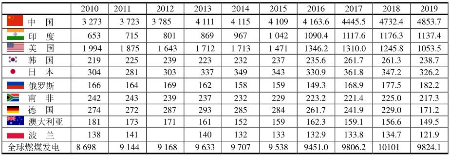 2010~2019年燃煤發(fā)電前十位國(guó)家(單位:TWh)