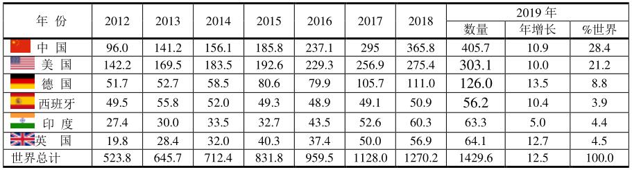 根據(jù)BP 2020年的報(bào)告,2019年全球風(fēng)電場(chǎng)年增長(zhǎng)12.5%,發(fā)電量為1429.6TWh,其中發(fā)電量最多的國(guó)家是中國(guó),中國(guó)于2016年超過(guò)美國(guó),2019年增長(zhǎng)10.9%,發(fā)電量為405.7 TWh,占全球風(fēng)電場(chǎng)發(fā)電總量的405.7/1429.6=28.4%。