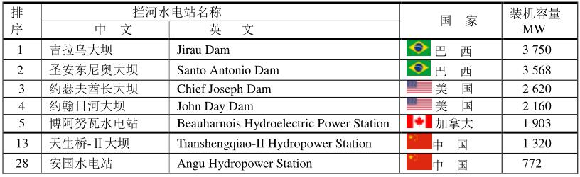 中國(guó)湖北省的三峽水電站仍然是世界上最大的水電站,總裝機(jī)容量為22.50 GW;位于巴西和巴拉圭的伊泰普水電站是世界第二大水電站,裝機(jī)容量為14.00 GW。不過(guò),伊泰普水電站所處的巴拉那河水量豐沛且季節(jié)分布相對(duì)均衡,幾乎可以全年滿負(fù)荷發(fā)電;而三峽水電站則每年都會(huì)經(jīng)歷約6個(gè)月的枯水期,從而限制了其發(fā)電量。