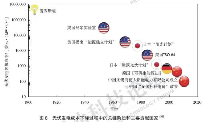 美國(guó)能源技術(shù)和公共政策學(xué)者Gregory F. Nemet于2019年出版著作《光伏如何變得便宜》(How Solar Became Cheap),書中介紹了光伏發(fā)電技術(shù)在歷史上的不同發(fā)展階段、成本變化的關(guān)鍵驅(qū)動(dòng)因素、關(guān)鍵國(guó)家對(duì)成本降低的貢獻(xiàn),以及光伏發(fā)電對(duì)其他低碳能源技術(shù)發(fā)展的經(jīng)驗(yàn)?zāi)P?。光伏發(fā)電的4個(gè)關(guān)鍵階段為:(1)20世紀(jì)50—70年代美國(guó)早期實(shí)驗(yàn)室研究,推動(dòng)每兆瓦時(shí)的裝機(jī)成本從10萬(wàn)美元級(jí)降到1萬(wàn)美元級(jí);(2)20世紀(jì)90年代的日本“屋頂光伏計(jì)劃”,推動(dòng)每兆瓦時(shí)裝機(jī)成本降至1000美元級(jí);(3)21世紀(jì)初德國(guó)《可再生能源法》的發(fā)布實(shí)施,推動(dòng)裝機(jī)成本降至1000美元/(MW·h)以下;(4)中國(guó)以“光伏標(biāo)桿電價(jià)”等強(qiáng)力政策推動(dòng)產(chǎn)業(yè)發(fā)展,促進(jìn)裝機(jī)成本降至100美元/(MW·h)以內(nèi)(圖8)。
