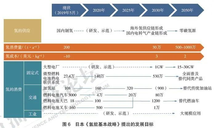 在能源消費(fèi)方面,2012—2016年,日本能源消費(fèi)總量減少了6.1%,接近實(shí)現(xiàn)2030年節(jié)能目標(biāo)所需的平均速度。日本能源轉(zhuǎn)型以氫能規(guī)?;脼轱@著特色和重要抓手,將氫能與電力和熱能并列定位為核心二次能源,并提出建設(shè)“氫能社會(huì)”的愿景,希望通過(guò)氫燃料電池實(shí)現(xiàn)氫能在家庭、工業(yè)、交通甚至全社會(huì)領(lǐng)域的應(yīng)用。日本在《氫能基本戰(zhàn)略》提出的主要發(fā)展目標(biāo)詳見圖6。