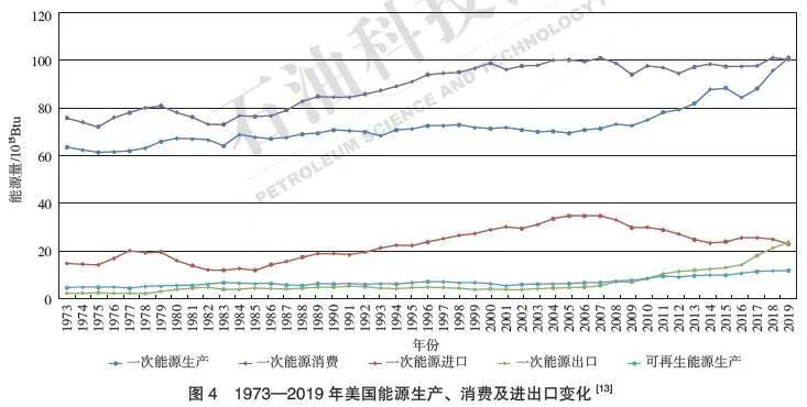 與歐洲的高比例可再生能源、激進(jìn)的碳減排目標(biāo)政策不同,美國(guó)能源轉(zhuǎn)型是在實(shí)現(xiàn)“能源獨(dú)立”的前提下推動(dòng)能源系統(tǒng)清潔化,以增加清潔能源(包括核電、可再生能源、天然氣和潔凈煤等)應(yīng)用比例為主要手段。2000年,美國(guó)和德國(guó)化石能源占一次能源消費(fèi)總量的比例分別是85%和88. 6%,從這一角度來(lái)看兩國(guó)能源轉(zhuǎn)型起點(diǎn)相似;2018年,美國(guó)和德國(guó)可再生能源在一次能源消費(fèi)量中所占比例分別為11.4%和16.6%,德國(guó)略勝一籌??v觀1973年以來(lái)美國(guó)的能源生產(chǎn)、消費(fèi)和進(jìn)出口情況,自2005年起,美國(guó)可再生能源和核電產(chǎn)量快速增長(zhǎng),清潔能源消費(fèi)比例加速上升;2010以來(lái),一次能源產(chǎn)量快速增長(zhǎng),并在2019年實(shí)現(xiàn)了“能源獨(dú)立”(圖4)。
