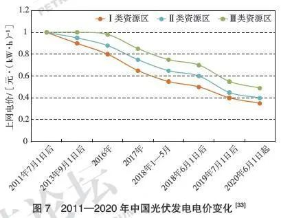 近年來(lái),在全球可再生能源成本迅速下降的過(guò)程中,除了政策支持和技術(shù)進(jìn)步以外,產(chǎn)業(yè)規(guī)模經(jīng)濟(jì)和規(guī)模效益是不容忽視的重要推力。中國(guó)得益于較為完備的基礎(chǔ)工業(yè)體系和龐大的市場(chǎng),在推動(dòng)風(fēng)電、光伏發(fā)電、生物質(zhì)發(fā)電、動(dòng)力電池、氫能利用等產(chǎn)業(yè)發(fā)展過(guò)程中,發(fā)揮了巨大的規(guī)模經(jīng)濟(jì)優(yōu)勢(shì)。2013年以來(lái),在國(guó)家政策的大力支持下,中國(guó)光伏發(fā)電產(chǎn)業(yè)不斷擴(kuò)大規(guī)模,迅速發(fā)展為全球最大的市場(chǎng),同時(shí)也擺脫了困擾光伏產(chǎn)業(yè)多年的“兩頭在外”的尷尬局面。2013—2018年,中國(guó)光伏裝機(jī)容量達(dá)到1.74×108kW,年復(fù)合增長(zhǎng)率超過(guò)73%,較2012年的0.065×108kW增長(zhǎng)26 倍。光伏發(fā)電上網(wǎng)電價(jià)從2011年的1元/(kW·h),下降到2020年的0.35~0.49 元/(kW·h)(2020年6月1日開始實(shí)施)(圖7)。在這一過(guò)程中,國(guó)內(nèi)涌現(xiàn)出一批優(yōu)秀的光伏企業(yè),在2019全球光伏企業(yè)20強(qiáng)排行榜上有16家中國(guó)公司,前10名中有7家中國(guó)公司。