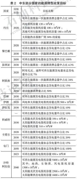 21世紀(jì)以來(lái),全球能源格局發(fā)生重大變化,以美國(guó)頁(yè)巖氣革命為代表的非常規(guī)油氣開采量爆發(fā)式增長(zhǎng),可再生能源產(chǎn)業(yè)高速發(fā)展,全球能源消費(fèi)中心不斷向發(fā)展中國(guó)家轉(zhuǎn)移。這些因素促使中東國(guó)家對(duì)后石油時(shí)代進(jìn)行戰(zhàn)略思考。近年來(lái),推進(jìn)能源轉(zhuǎn)型、擴(kuò)大可再生能源應(yīng)用比例逐步進(jìn)入政府部門的視野,沙特阿拉伯、阿聯(lián)酋、卡塔爾、科威特等國(guó)相繼制定了多項(xiàng)政策目標(biāo)(表2)。