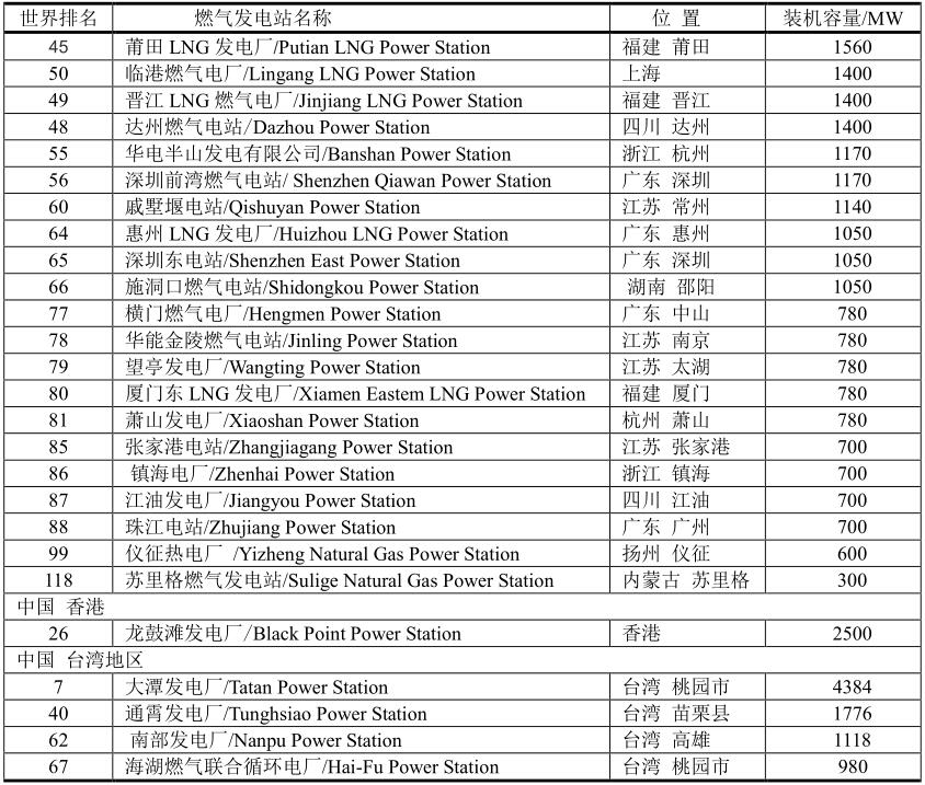 中國最大的燃氣發(fā)電站在中國臺灣地區(qū)—大潭發(fā)電廠(Tatan Power Station),其次是香港—龍鼓灘發(fā)電廠(Black Point Power Station)。