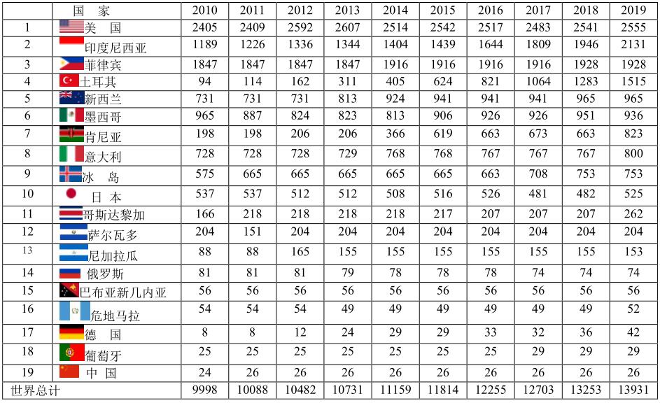2019年占地?zé)嵫b機(jī)總?cè)萘孔疃嗟氖敲绹?18.3%)、印度尼西亞(15.3%)、菲律賓(13.8%)、土耳其(10.9%)、新西蘭(6.9%)。中國排序第19名,地?zé)嵫b機(jī)容量進(jìn)展不大。