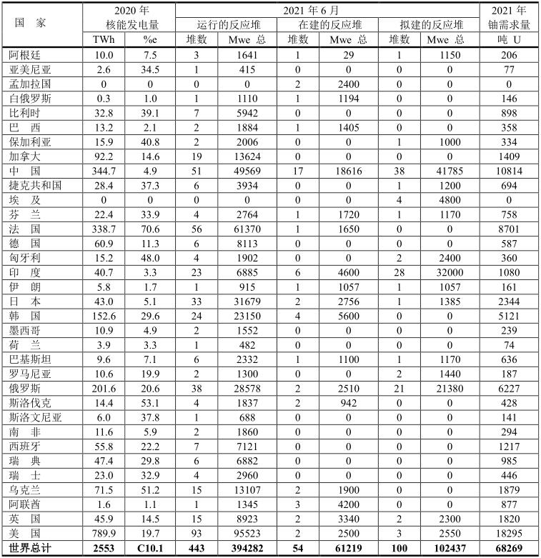 表中“%e”表示核能發(fā)電占發(fā)電總量的百分率。全球核能發(fā)電占全球發(fā)電總量的10.1%,其中法國高達70.6%。本數(shù)據(jù)是世界核能協(xié)會WNA 2021年1月份提供的數(shù)據(jù)。