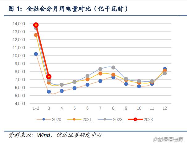 整體來(lái)看,1-3 月全國(guó)全社會(huì)用電量 21203 億千瓦時(shí),同比增長(zhǎng) 3.6%;其中,1-2 月全社 會(huì)用電量同比增長(zhǎng) 2.30%,3 月全社會(huì)用電量同比增長(zhǎng) 5.9%。1-2 月由于疫情余波尚在、 疊加春節(jié)假期和暖冬因素,電力消費(fèi)水平較為萎靡;3 月開(kāi)工復(fù)蘇潮漸起,電力消費(fèi)增速 提高、需求回暖明顯。