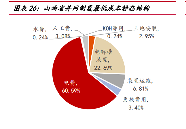 山西省經(jīng)濟(jì)利用小時數(shù)為 1915 小時,并網(wǎng)制氫單位成本最低:截止 2022Q3,山 西省風(fēng)電光伏裝機(jī)量占比位列全國第 14,但由于負(fù)荷較少,山西省低電價小時數(shù)在 五個省份中較為顯著, 0~0.05 元/kWh 共計 1341 小時,0.3~0.35 元/kWh 共計 1219 小時,低電價優(yōu)勢明顯。經(jīng)過我們的測算,當(dāng)利用小時數(shù)為 1915 小時,綜合電價 0. 1868 元/kWh,山西制氫成本最低為 15.2 元/kg,考慮氧氣售后沖減費用,制氫成本 下降至 9.6 元/kg。山西省并網(wǎng)制氫成本結(jié)構(gòu)中,因現(xiàn)貨市場低電價優(yōu)勢顯著,電費 占比相對較低,僅 60.59%,電費之中,電能量價格占 42%,輸配容量價格占 36%。