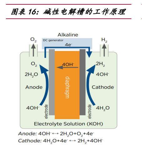 按照工作原理和電解質(zhì)的不同,電解水制氫技術(shù)可分為 4 種。堿性電解水技術(shù) (ALK)、質(zhì)子交換膜電解水技術(shù)(PEM)、高溫固體氧化物電解水技術(shù)(SOEC)和固體聚合物陰離子交換膜電解水技術(shù)(AEM)。其中,堿性電解槽的成本較低,經(jīng)濟(jì)性較好,2022 年國內(nèi)堿性電解槽出貨占 97%,但相較于 PEM 的靈活性較差,PEM 受限于質(zhì)子膜高成 本,總體設(shè)備成本是堿性電解槽 3-4 倍。 堿性電解槽的電解液一般為 30%質(zhì)量濃度的 KOH 溶液或者 26%質(zhì)量濃度的 NaOH 溶液。在直流電的作用下,陰極發(fā)生還原反應(yīng),生成氫氣和氫氧根離子,陽極發(fā)生氧 化反應(yīng),生成氧氣和水。經(jīng)過氣水分離器將氣體和溶液分離,電解液回流至電解槽, 氫氣和氧氣分別進(jìn)入純化裝置提純后進(jìn)行收集。