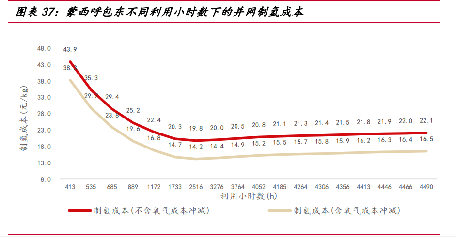 蒙西經(jīng)濟(jì)利用小時數(shù)為 2516 小時,成本有較大下降空間:蒙西低電價小時數(shù)相 對分散,-0.05~0 元/kWh 共計 408 小時,0.25~0.3 元/kWh 共計 561 小時,整體上并 網(wǎng)制氫成本劣于山西和甘肅省,但優(yōu)于山東和廣東省。當(dāng)利用小時數(shù)為 2516 小時, 綜合電價 0.308 元/kWh,蒙西并網(wǎng)制氫成本最低為 19.75 元/kg,考慮氧氣售后沖減 費用,制氫成本下降至 14.15 元/kg。蒙西并網(wǎng)制氫成本結(jié)構(gòu)中,電費占比 76.84%。 電費之中,電能量價格占 71%,輸配容量價格占 14%??紤]到蒙西有豐富的風(fēng)光發(fā)電 資源,未來風(fēng)光發(fā)電滲透率提升空間較大,電價分布或?qū)⑦M(jìn)一步左偏,降低并網(wǎng)制氫 成本。