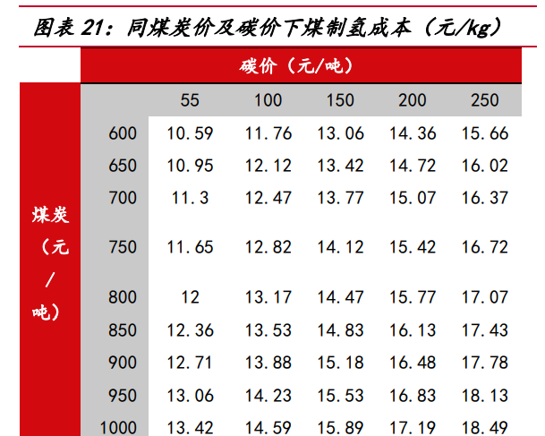 若考慮碳排放價格,化石能源制氫經(jīng)濟(jì)性進(jìn)一步下降。根據(jù) IEA,煤制氫路線 1kg 氫氣產(chǎn)生約 26kg 二氧化碳、天然氣制氫路線 1kg 氫氣產(chǎn)生約 10kg 二氧化碳,按照當(dāng) 前中國碳排放價格為 55 元/噸計算,考慮碳價后煤制氫、天然氣制氫成本將分別達(dá)到 12.7 元/kg、22.3 元/kg,在碳減排壓力下,碳配額發(fā)放或?qū)⑹站o,推動碳價上行, 當(dāng)碳價上漲至 200 元/噸時,煤制氫、天然氣制氫成本將分別達(dá)到 16.5 元/kg、23.8 元/kg,電解水制氫相對化石能源制氫或?qū)⒏呓?jīng)濟(jì)優(yōu)勢。