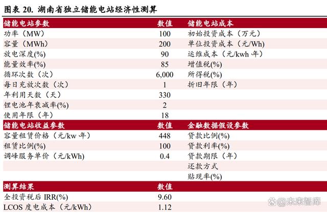 獨(dú)立儲能電站經(jīng)濟(jì)性可觀。我們以湖南省的實際情況為例,來測算獨(dú)立儲能電站的經(jīng)濟(jì)性,在目前 的各種條件下,湖南省獨(dú)立儲能電站的全投資稅后 IRR 達(dá)到 9.60%,具有客觀的收益性。 1)容量租賃收入假設(shè):參考湖南省的城步儒林 100MW/200MWh 儲能電站項目已經(jīng)簽訂的容量租賃 合同,湖南省的容量租賃價格為 448 元/kw*年。2)電力輔助服務(wù)收入假設(shè):電力輔助服務(wù)包括為電網(wǎng)公司提供調(diào)峰、調(diào)頻等服務(wù),按照每次調(diào)用規(guī) 模及調(diào)用次數(shù),電網(wǎng)公司給儲能電站支付費(fèi)用。 參考湖南省的現(xiàn)行 政 策以及城步儒林 100MW/200MWh 儲能電站項目的運(yùn)行情況,假設(shè)一年調(diào)用 330 天,每天一次充放,調(diào)用費(fèi)用為每 次 400 元/MWh。