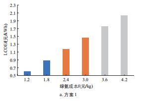 通過兩個方案進行燃料電池儲能經(jīng)濟性評估,均按容量為1 MW 的燃料電池計算,運行周期為10 年,固定資產(chǎn)殘值為10%,用氫量為83.5 t/ 年。其中,方案A 為燃料電池發(fā)電,年利用小時數(shù)為2000 h,轉(zhuǎn)化效率為60%,發(fā)電量為200 萬kWh;方案B 為燃料電池熱電聯(lián)供,年利用小時數(shù)為3000 h,轉(zhuǎn)化效率為90%,發(fā)電量為300 萬kWh。兩種方案的不同綠氫成本對應的LCOE 如圖3 所示。