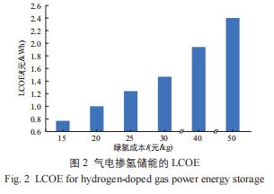 按1 臺容量為50 萬kW 的燃氣機組100%摻氫計算,燃氣電站投資單價為2600 元/kW,增加儲氣設施的投資為3000 萬元,年利用小時數(shù)為3000 h,運行周期為20 年,固定資產(chǎn)殘值為10%。按等熱值換算后的燒氫量為7 萬t/ 年,發(fā)電量為15 億kWh,計算得到不同綠氫成本對應的氣電摻氫儲能的LCOE,具體如圖2 所示。
